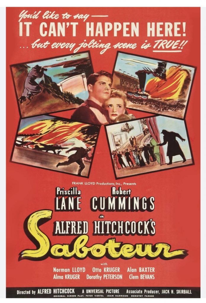 In the midst of all this, a certain Alfred Hitchcock was two movies into his Hollywood directing career. As British voices in the US went, few were in such a position to influence public opinion, and, as his homeland endured the Blitz, Hitchcock began pushing a film called “Saboteur”. With the idea rejected by his regular producer, David O. Selznick, the project was eventually accepted by Universal.